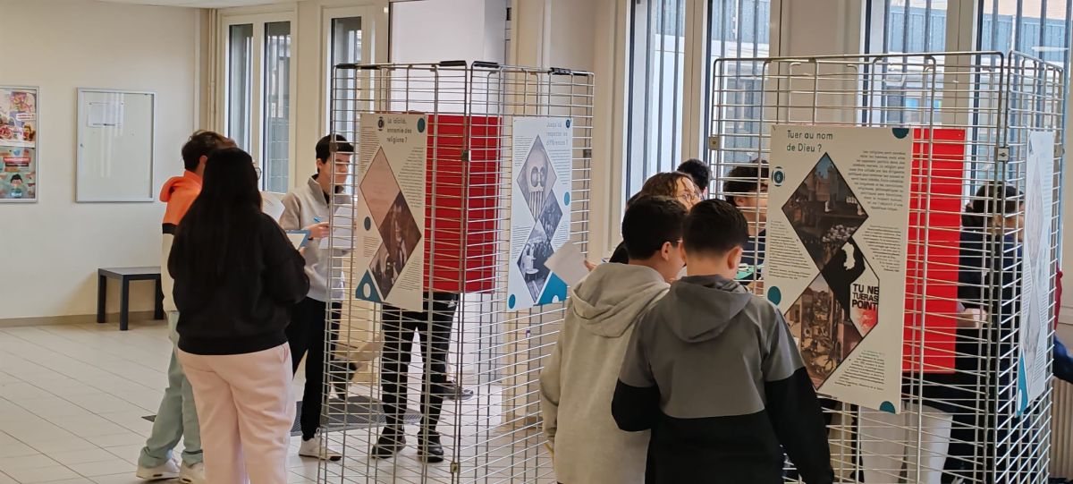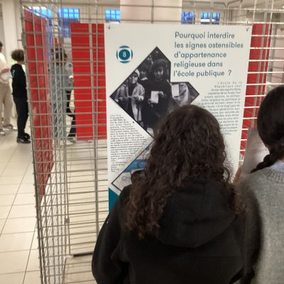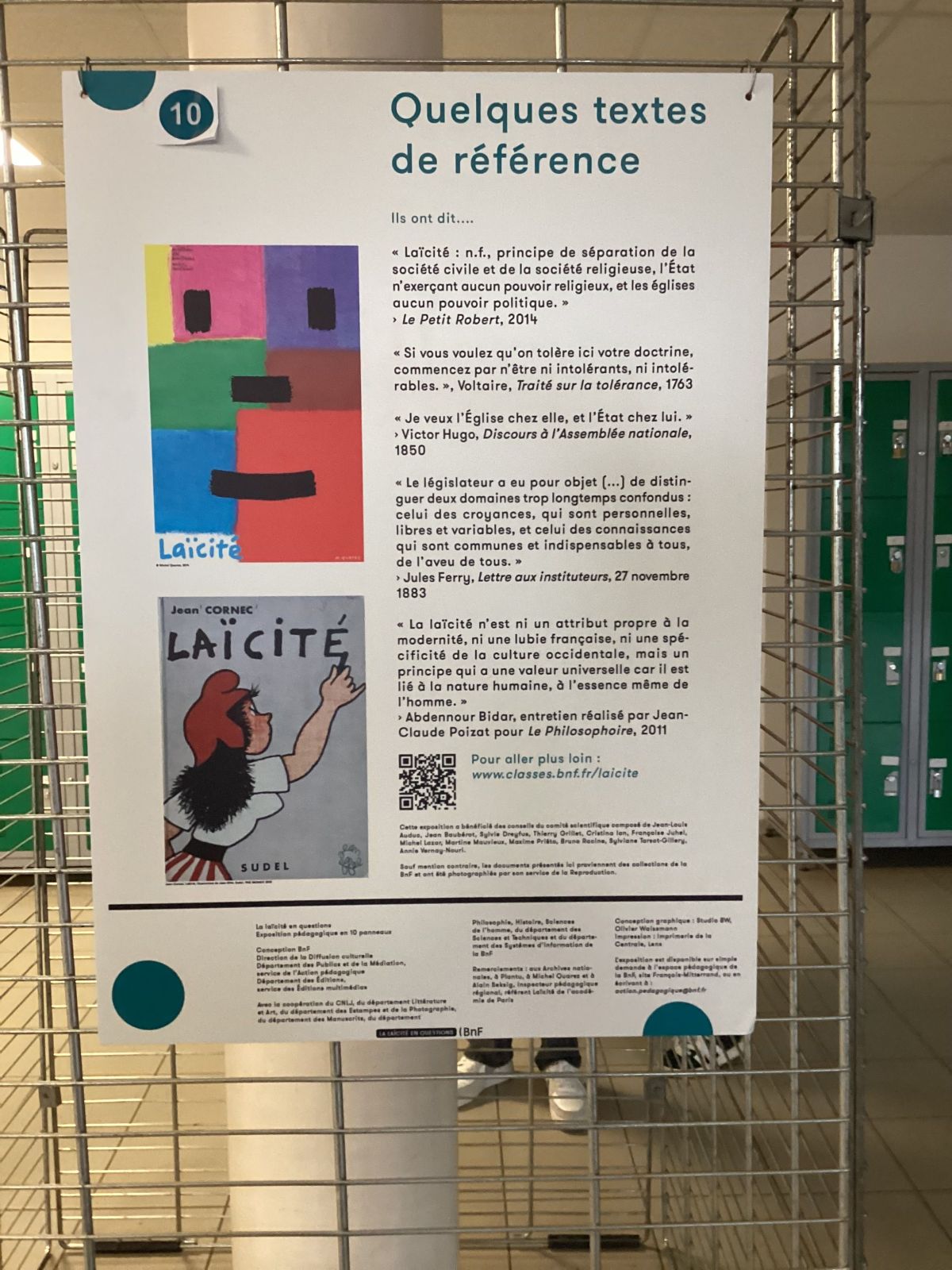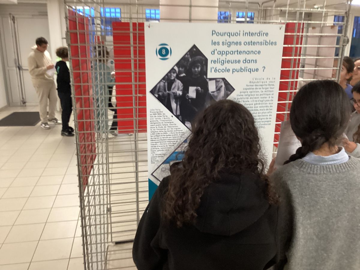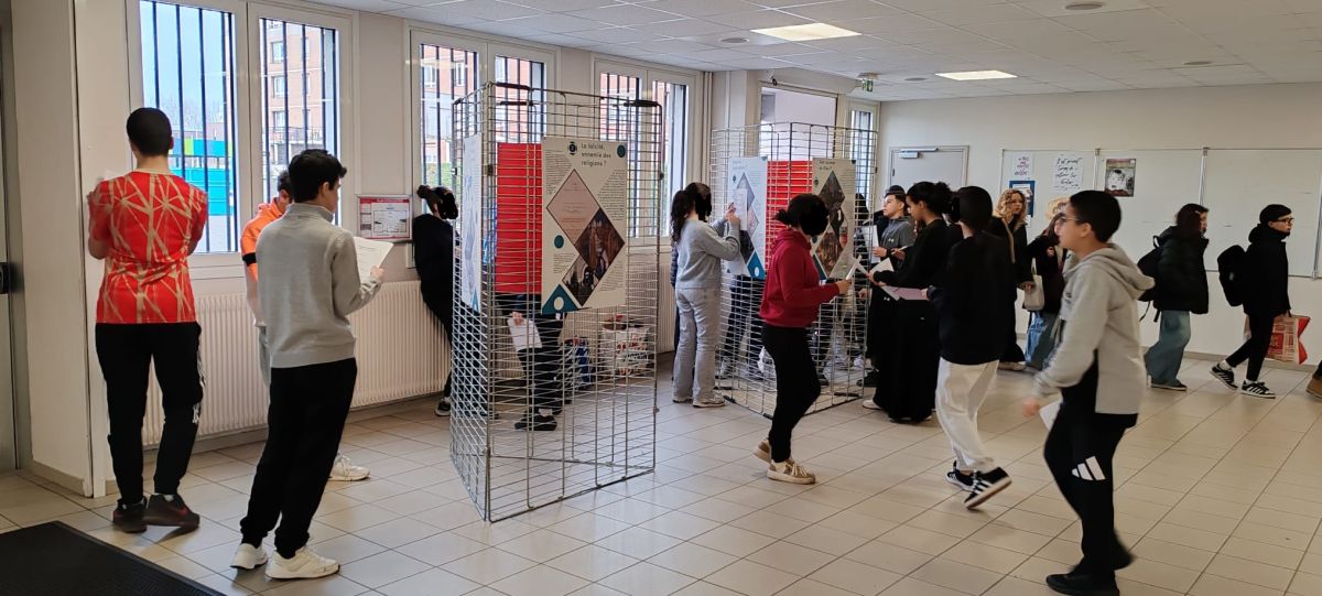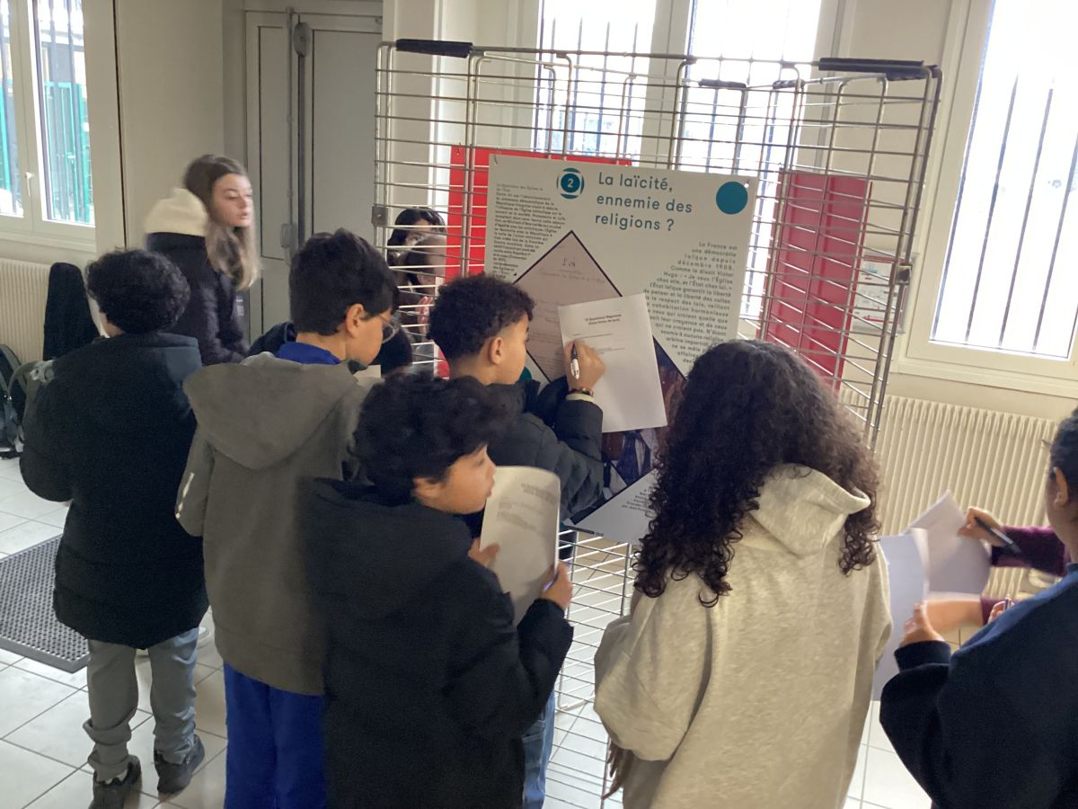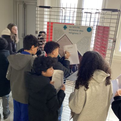 Dans le cadre des programmes d'EMC, les élèves de 5e, 4e, 3 élèves ont pu être sensibilisés à la Laïcité avec leurs professeurs Mme Laly et M. Faës. Le mardi 9 décembre a eu lieu le 120 ème anniversaire de la loi sur la séparation des Églises et de l'État. M. Dabach, référent "Laïcité" à la mairie de Grande-Synthe, nous a aimablement prêté l'exposition afin que les élèves puissent effectuer un travail autour de la Laïcité, de la tolérance et du vivre ensemble.