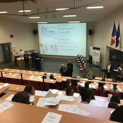 Le mercredi 2 juin 2022 a eu lieu la cérémonie de remise des prix du CNRD (Concours National de la Résistance et de la Déportation). Les élèves de 3eB ont reçu le prix départemental de l'Engagement. Ils étaient en compétition avec 400 élèves à l'INSPE de Villeneuve d'Ascq. C'est Louis, Sevval et Sirine qui les ont représentés. Merci à eux!